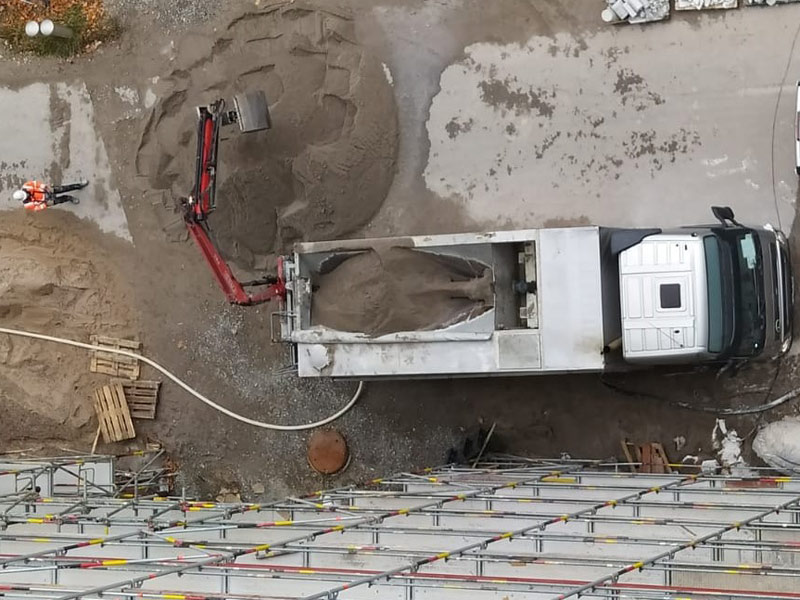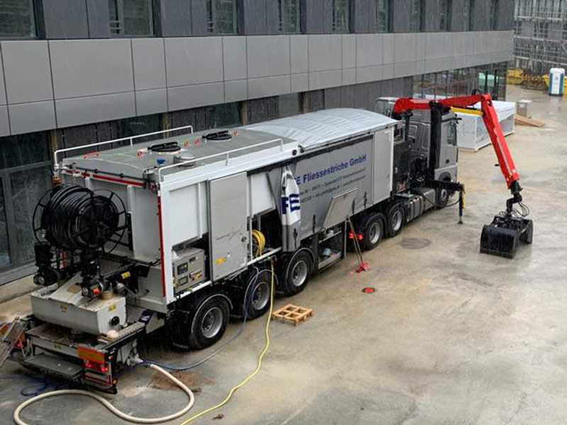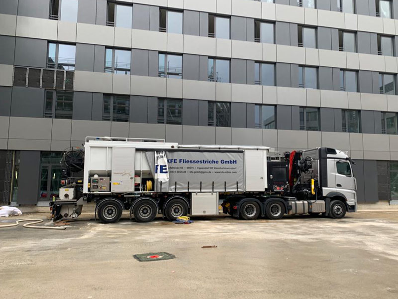 Unsere Mixtrucks haben eine Pumpleistung von bis zu 27 Tonnen pro Stunde und pumpen in bis zu 120 Meter Höhe. Wir verarbeiten die Komponenten direkt auf der Baustelle zu Fliessestrich. Wir liefern in ganz Deutschland und in die Nachbarländer.